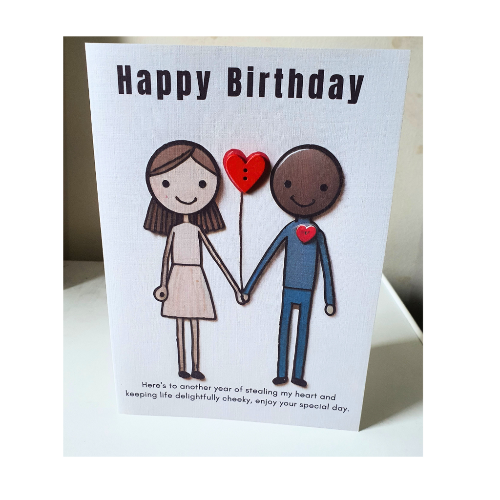 "Lovebirds Celebration: Quirky Button Birthday Card at Camieroseuk"