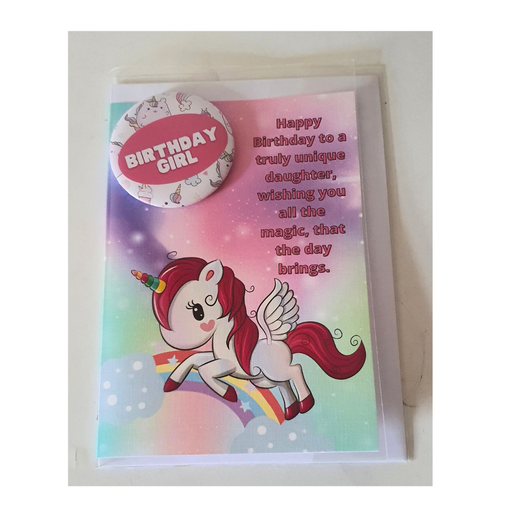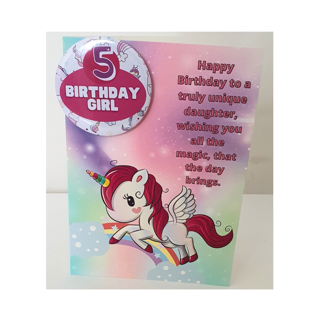 Unicorn birthday card with badge, customised cards at Camieroseuk