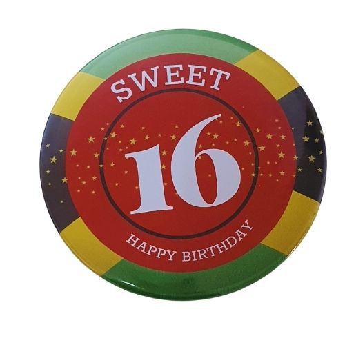 Celebrate the significant milestone of Sweet 16 in true Jamaican style with our personalized 75mm button pin birthday badge! Turning 16 is a momentous occasion, and we've crafted this badge to capture the essence of this special age. Embrace the vibrancy of Jamaican culture and mark this important milestone with a unique keepsake that will be cherished for years to come.