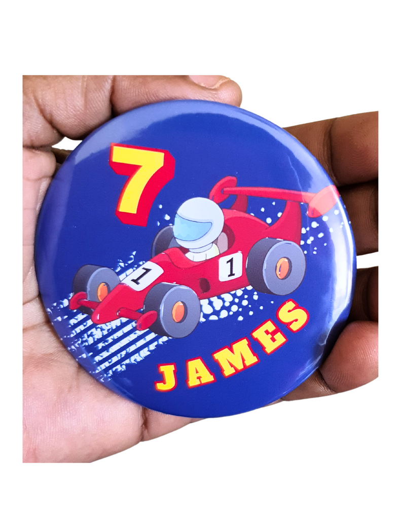 Race Car theme Birthday Badge - 75mm Customized Buttons by Camieroseuk"