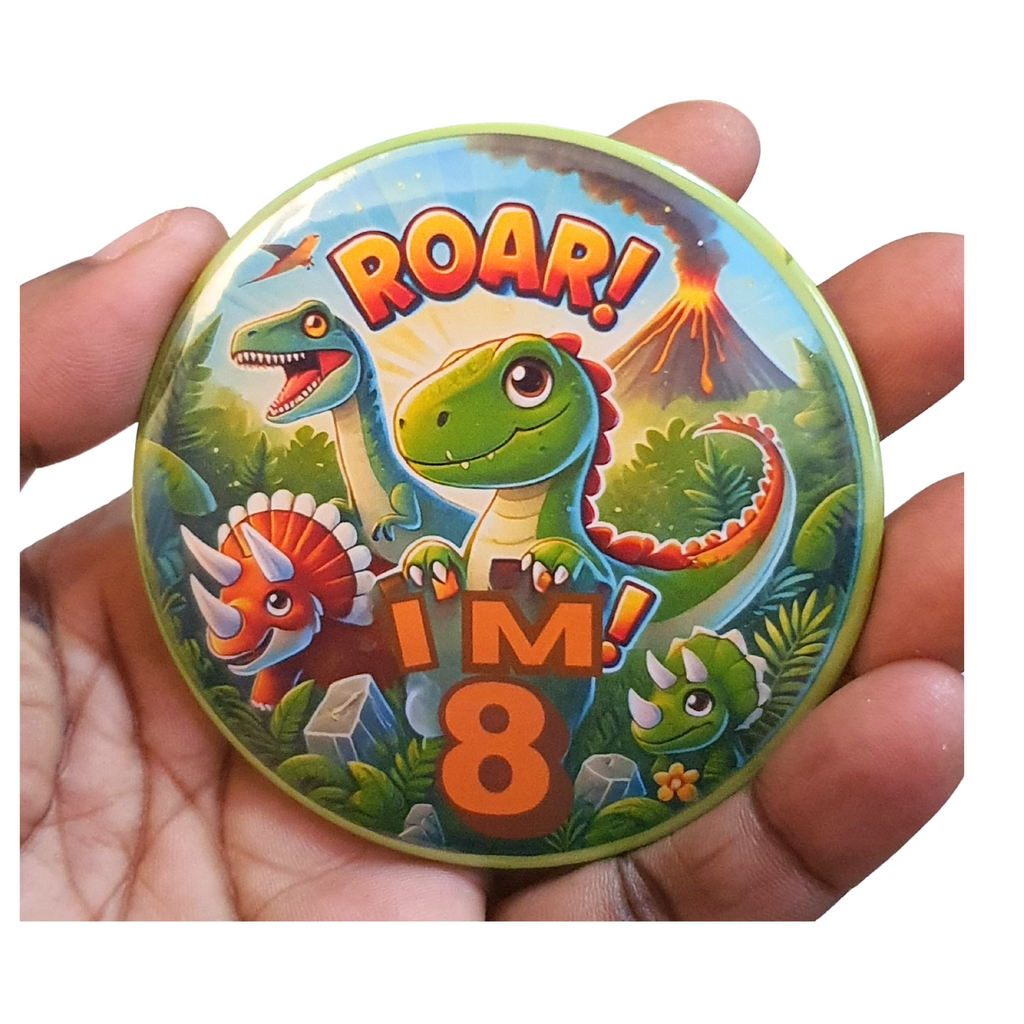 Dino Friends Birthday Badge – 75mm Customised Handmade by CamieRoseUK