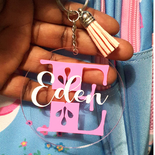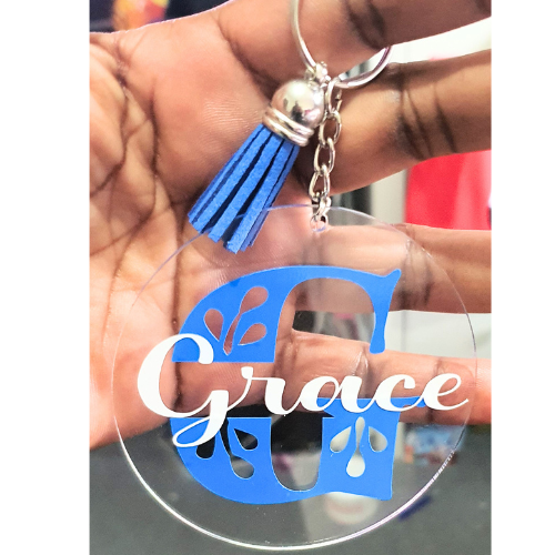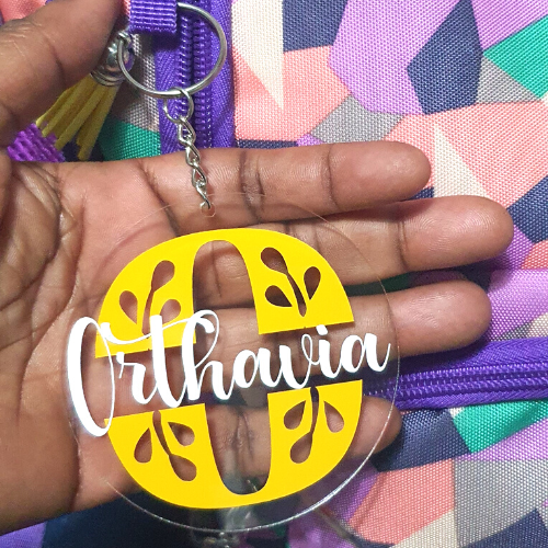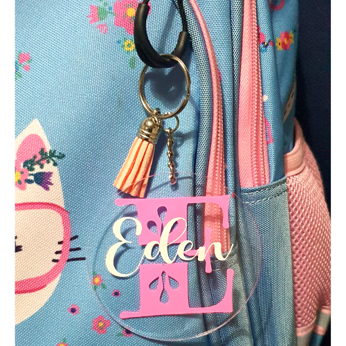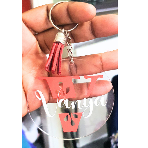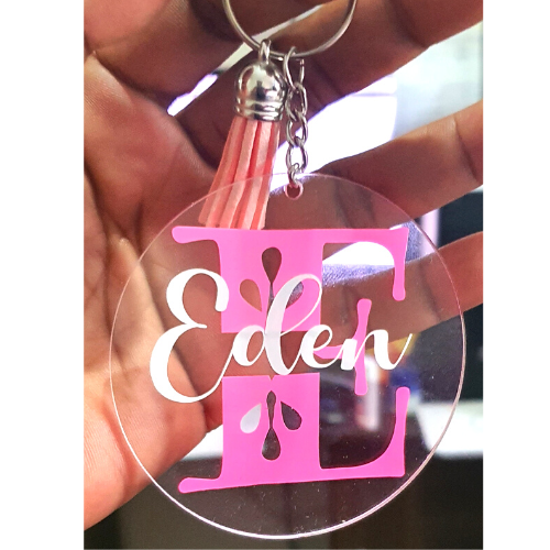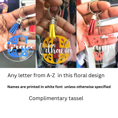 Acrylic keyrings with complimentary tassel, floral design in a multitude of colours. The keyrings are approximately 3inches in size, our designs are created using self adhesive vinyl material. Use the colour scheme as a guide in selecting your preferred colour font. The name is customised in white but please let us know if you would prefer another colour, for example black. Our keyrings make great gift for children, perfect customised accessories for school bags or even stocking fillers.