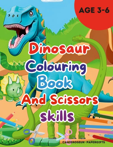 Colour and Cut: engaging and interactive dinosaur colouring book designed to spark creativity and develop essential scissor skills in young children. With delightful illustrations and exciting cutting activities, this book is perfect for children aged 3 to 6. Your child will embark on a colouring adventure, bringing life to their Jurassic friends with vibrant hues. The book is divided in two sections. The first half of the book is solely dedicated to colouring, whereas the subsequent section introduces scissors skills. Children can still colour in the illustrations while practicing their fine motor skills as they cut along dotted lines.