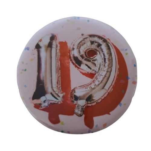 This 75mm nineteenth birthday badge features a balloon and confetti design and can be personalized with a name. Help the celebrant mark their last teen year with a festive accessory. With a durable plastic pinback, this badge is made to last and arrive secure, ready to be pinned to a favorite jacket, shirt, or bag. Whether given as a birthday gift or kept for yourself, this badge is sure to bring a festive feel to any celebration.