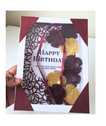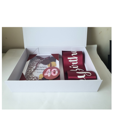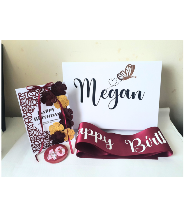 "Give a timeless gift with our exquisite gift boxes. Each box includes a sash, birthday button, and handcrafted greeting card, all presented in a beautiful custom box. Personalize the pieces to your preference.The card is Crafted With Lots Of Beautiful Details, The Floral Pieces And Swirly Background Have Been Mounted On 300gsm White Card Stock. The Card Comes In A Matching Box Which Has Also Being Handmade, The Box Boast A Beautiful Window Created From Acetate Material Which Showcase The Card. The Four Corner Pieces Shown On The Outer Face Of The Box Have Been Cut From 280gsm Coloured Card Stock. All Our Boxes Have Been Hot Glued For Durability.