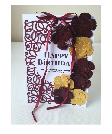 Card Details: burgundy And gold, Die Cut And Heat Embossed, Matching Ribbon, Packaged In A See Through Matching Box.