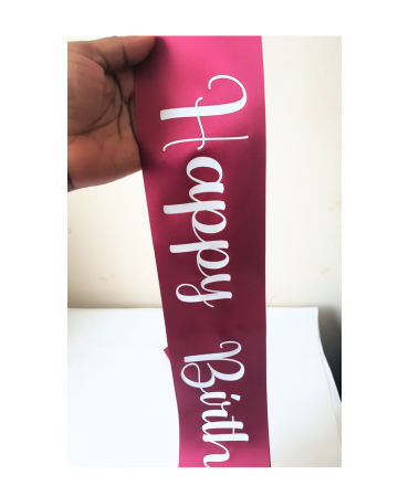 Sash Details: Burgundy, with white happy Birthday print created from heat transfer vinyl, add a name to complete the look, Sash Size available: 2m - Large Adult.