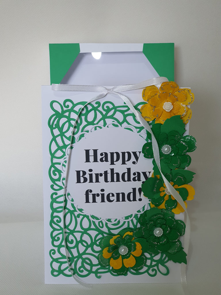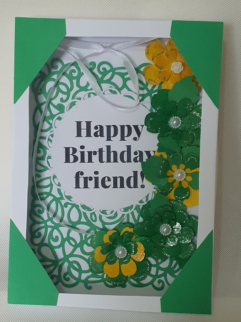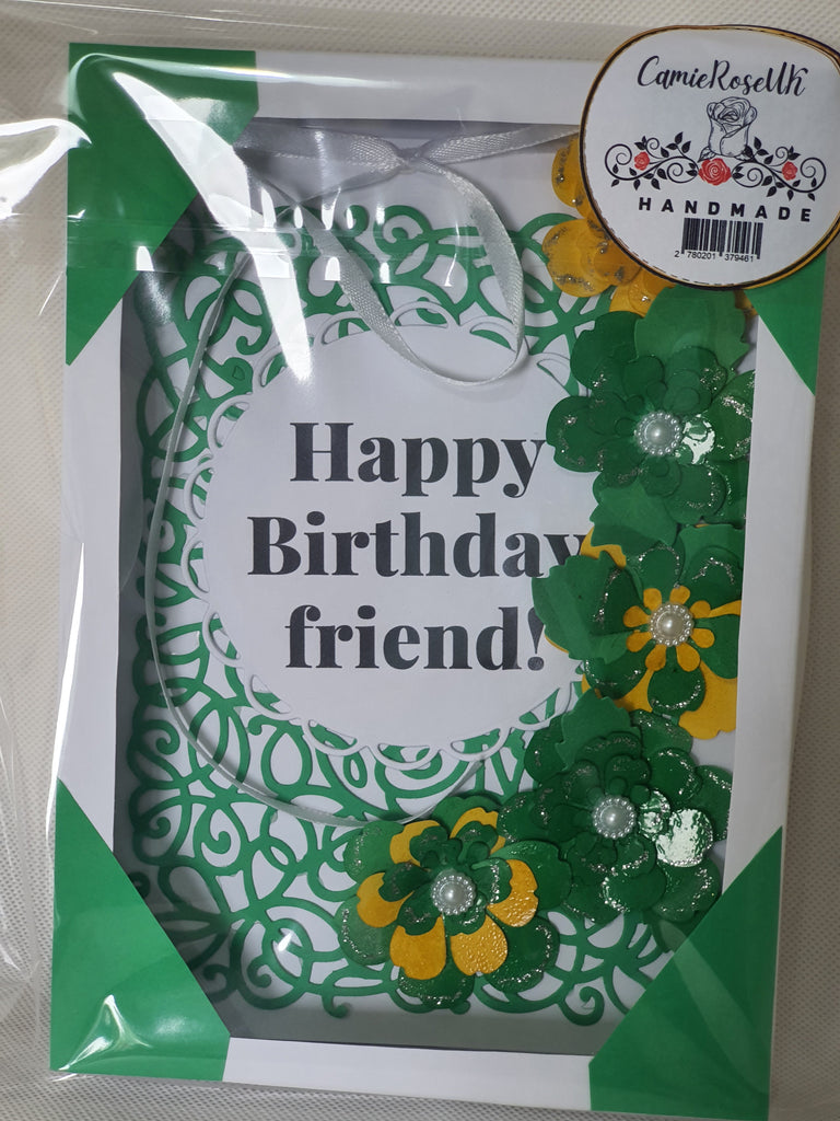 Card details: green and yellow, (Evy Rose) die cut and embossed, matching ribbon, glitter and pearl details, packaged in a see through matching box.