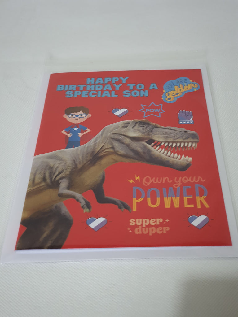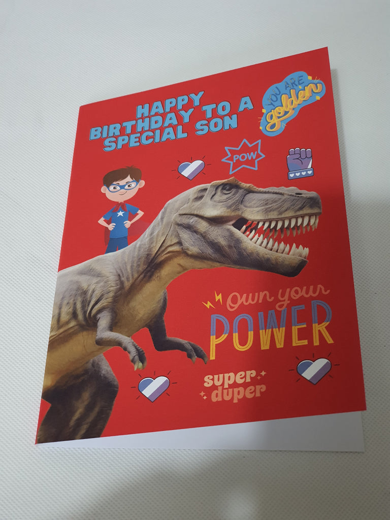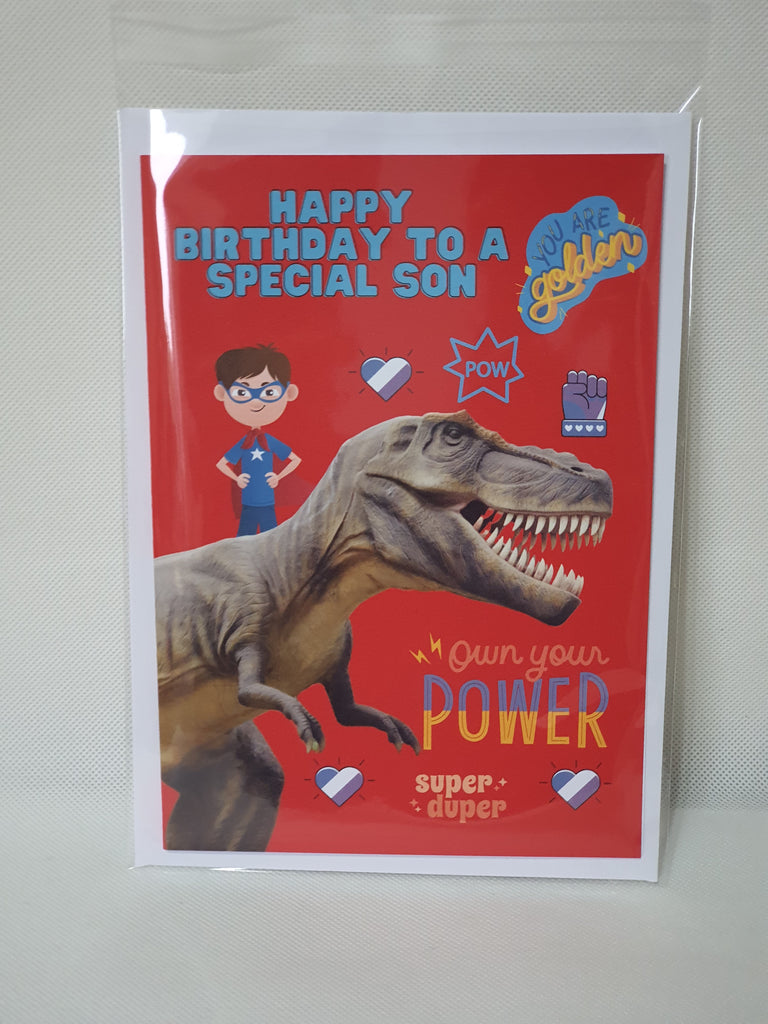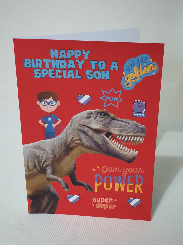 Birthday card featuring a roar some dinosaur for the son. The card comes with a short message at the front and is blank on the inside. The card is A5 in size and printed on high quality 300gsm cardstock, all our cards are supplied with envelopes.