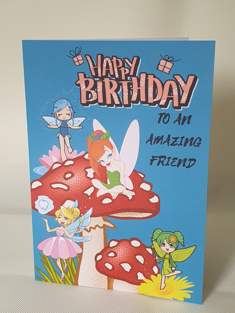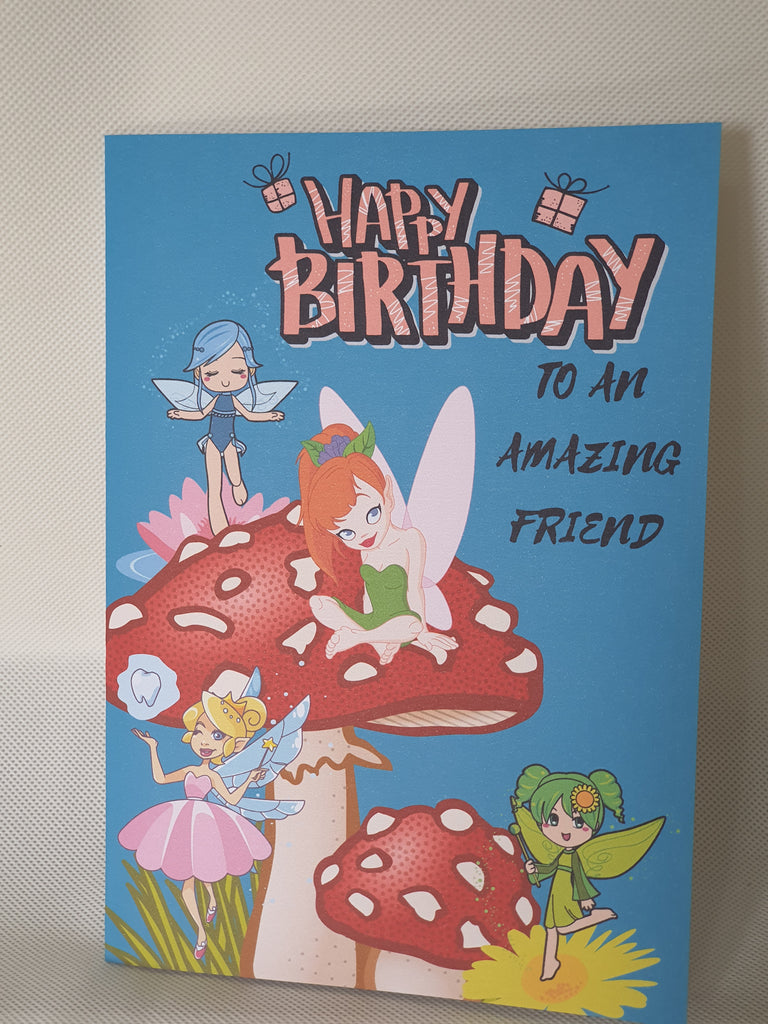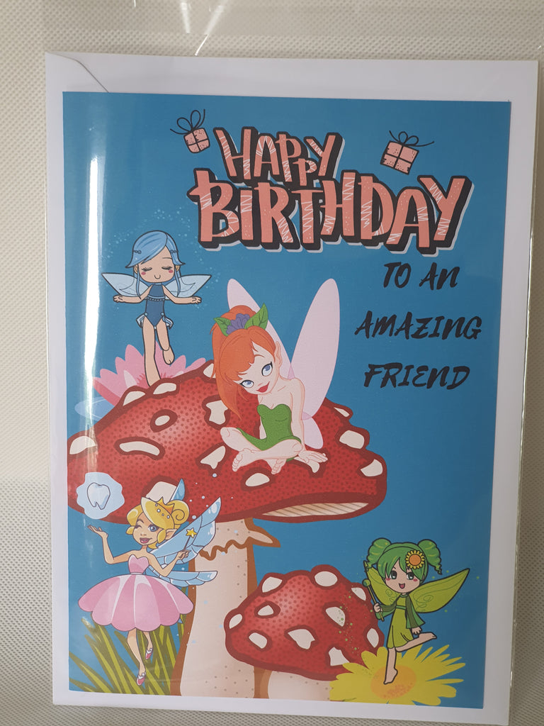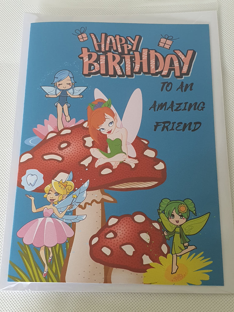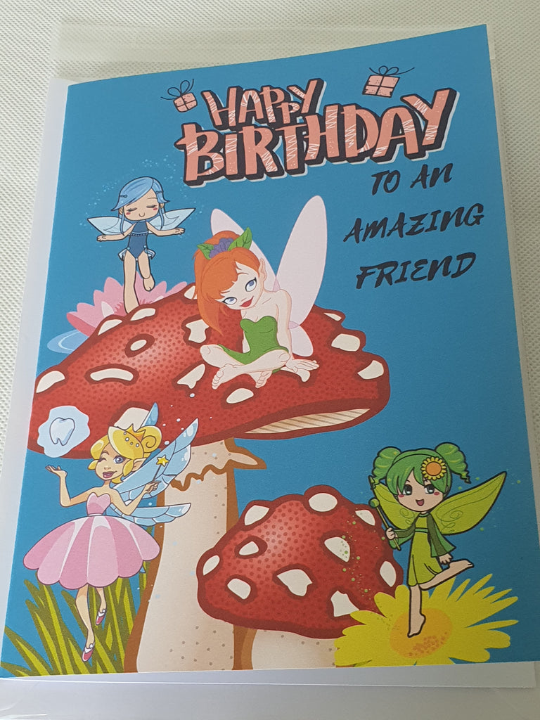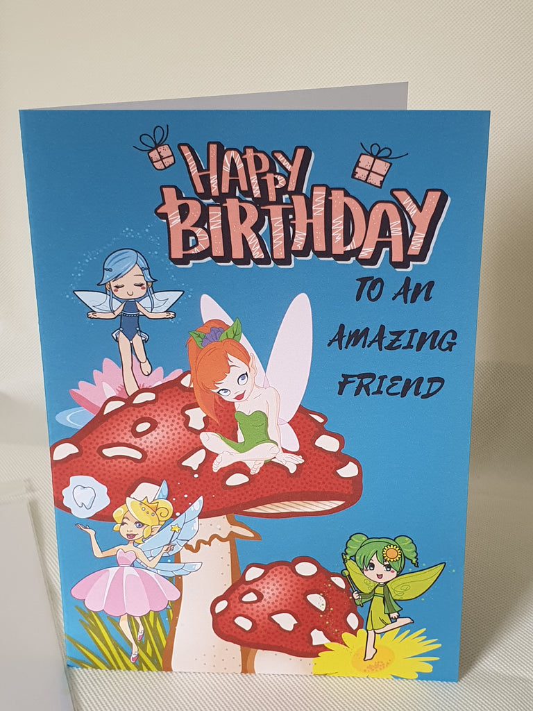 Happy birthday to an amazing friend, fairy friendship card with lots of vibrant colours. Give them something special on their big day, for the one who loves a bit of fairy magic. The card comes with inside message but can also be customised at the buyers request, please leave us a message regarding customisation. The card is A5 in size and printed on 300gsm cardstock. It is dispatched to you in an envelope and cello bag, so we can ensure your card arrives in pristine condition.