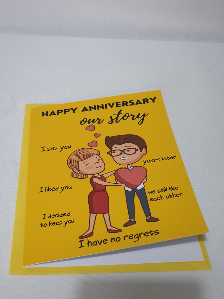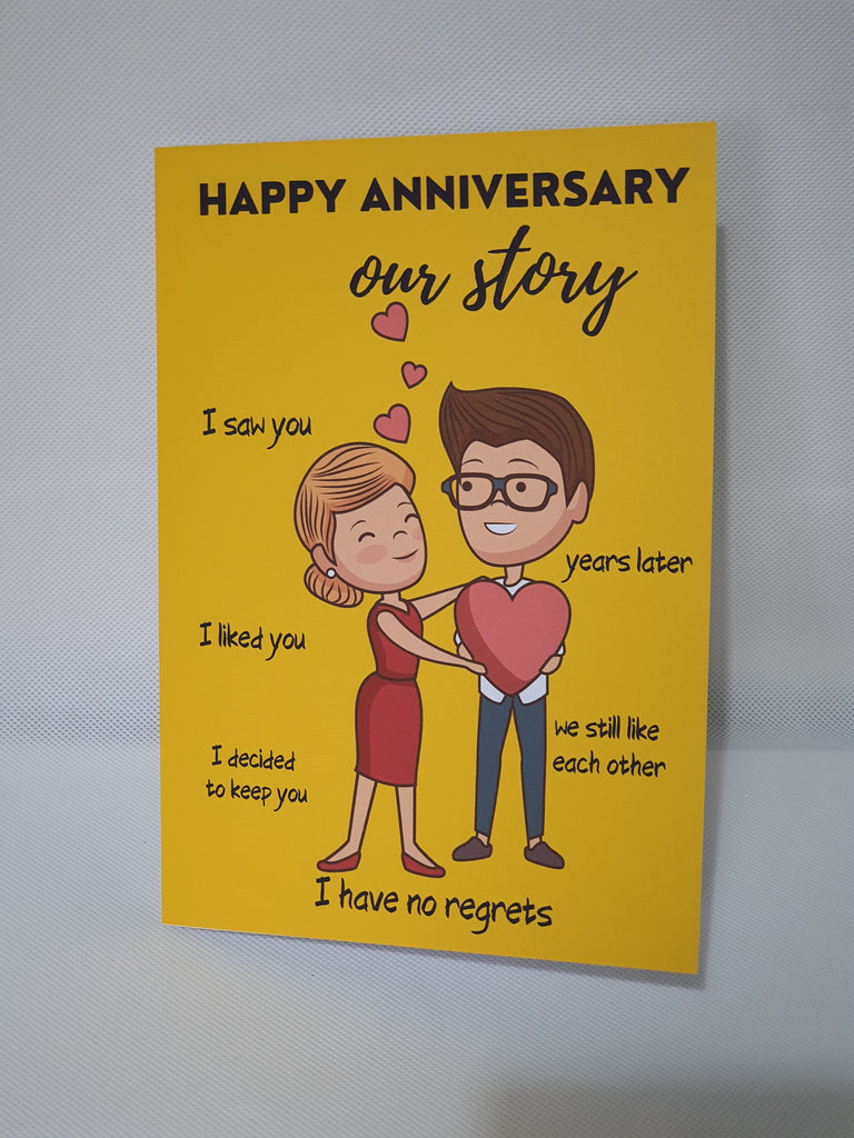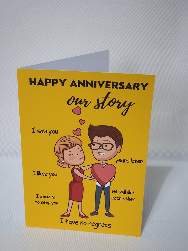 Happy anniversary our story card, can you think of a better way to rein in the celebrations than with a bit of light humour and a trip down memory lane. The card is A5 in size and printed on high quality 300gsm cardstock, it is blanked on the inside but can be customised at the buyers request, please leave us a message at checkout regarding customisation. We dispatch all our cards in an envelope and cello bag, this ensures that your card gets to you in pristine condition.