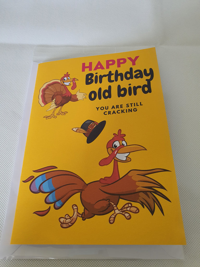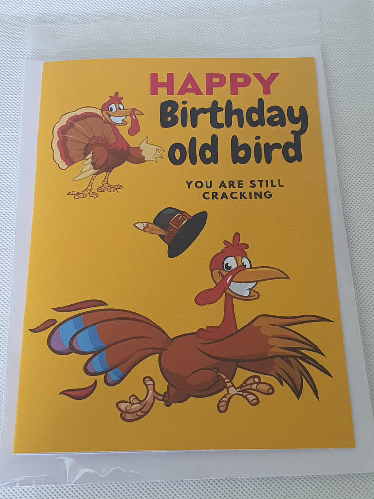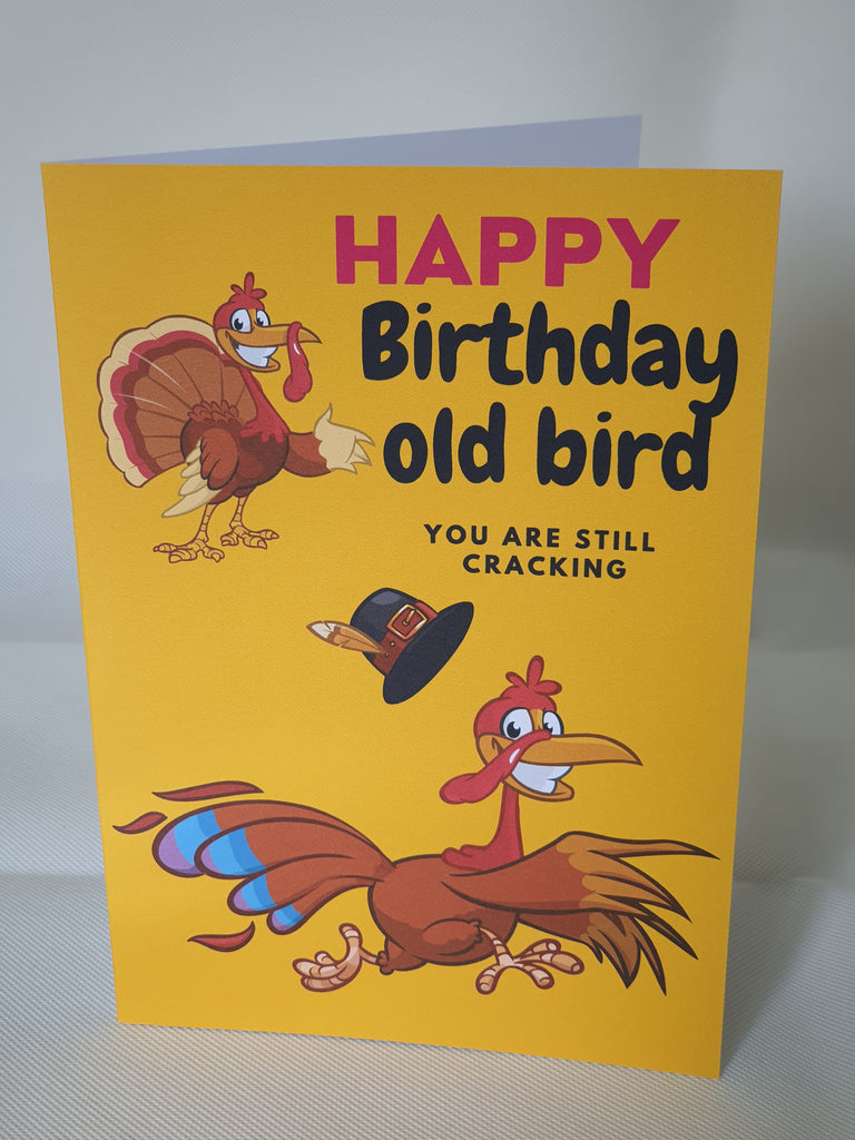 Funny happy birthday old bird birthday card for a friend with bold inside text. Why be serious when you can have a laugh, give them a smile on their birthday. The card is blank on the inside it is A5 in size and printed on high quality 300gsm cardstock. All our cards are supplied with envelopes.
