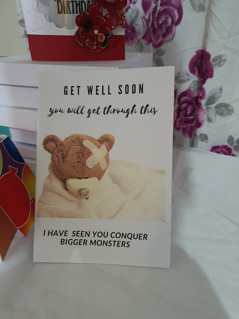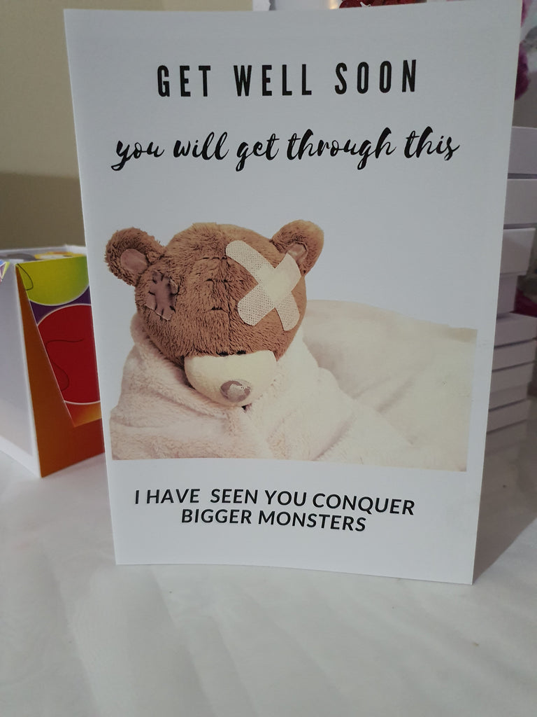 Shopping around for get well soon cards, then check out our super cute range of teddy bear designs. Show them how much you care with a CamieRose card, everything you need to say have already been written for you. Give a simple card that says more and offer some encouragement, sometimes all a person need to fight that much harder when they are down is just to know someone cares. The card is A5 in size and blank on the inside, however you can request customisation at checkout. We dispatch all our cards in a cello bag and envelope, this ensures your card arrives in pristine condition.