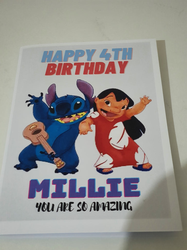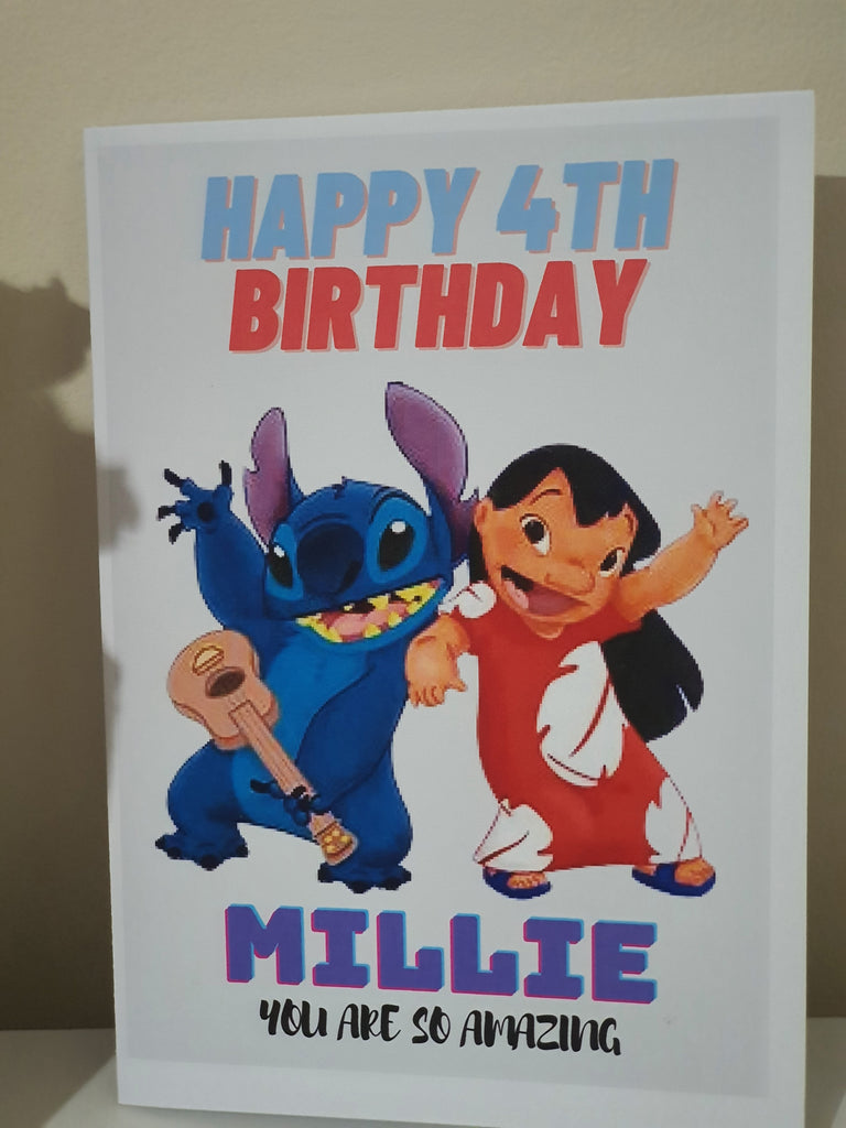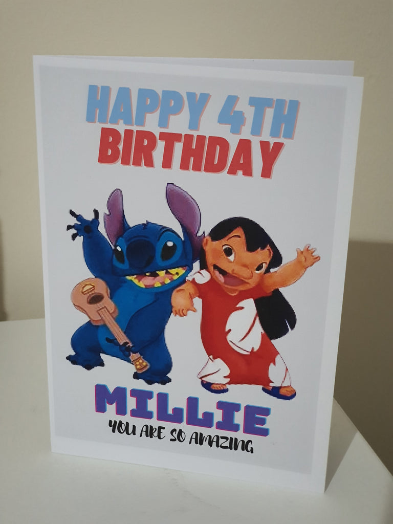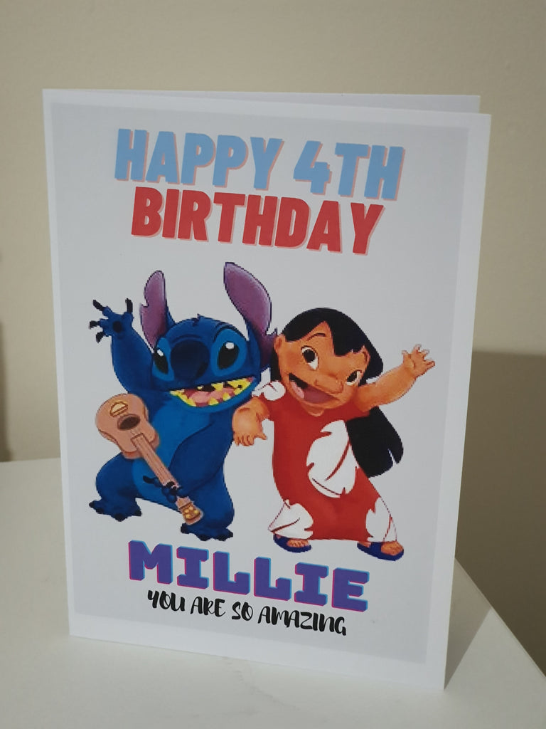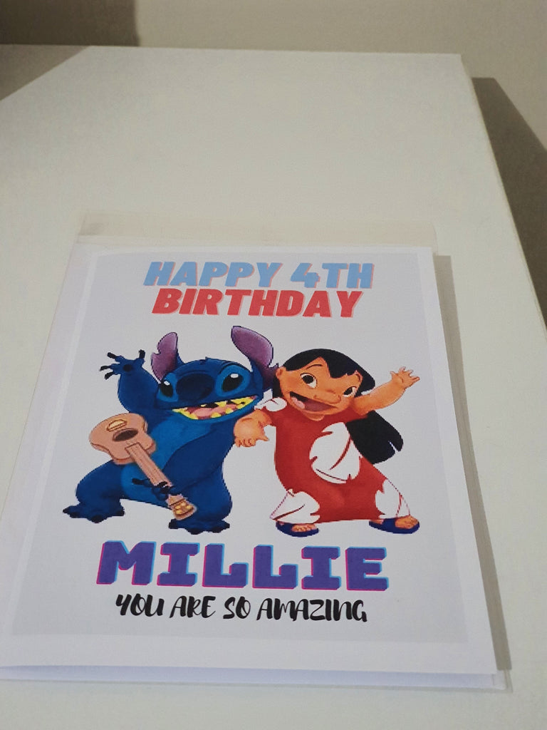 Lilo and Stitch birthday card, who does not love these two little friends, help your little one rein in their birthday with best friends Lilo and Stitch. This little card from our range makes for a wonderful birthday starter, printed on 300gsm card stock. The card is A5 in size, it would be sure to put a smile on their little face. The card is blank on the inside but can be personalised with your own text if required. It comes packaged in cello bag and includes an A5 envelope.