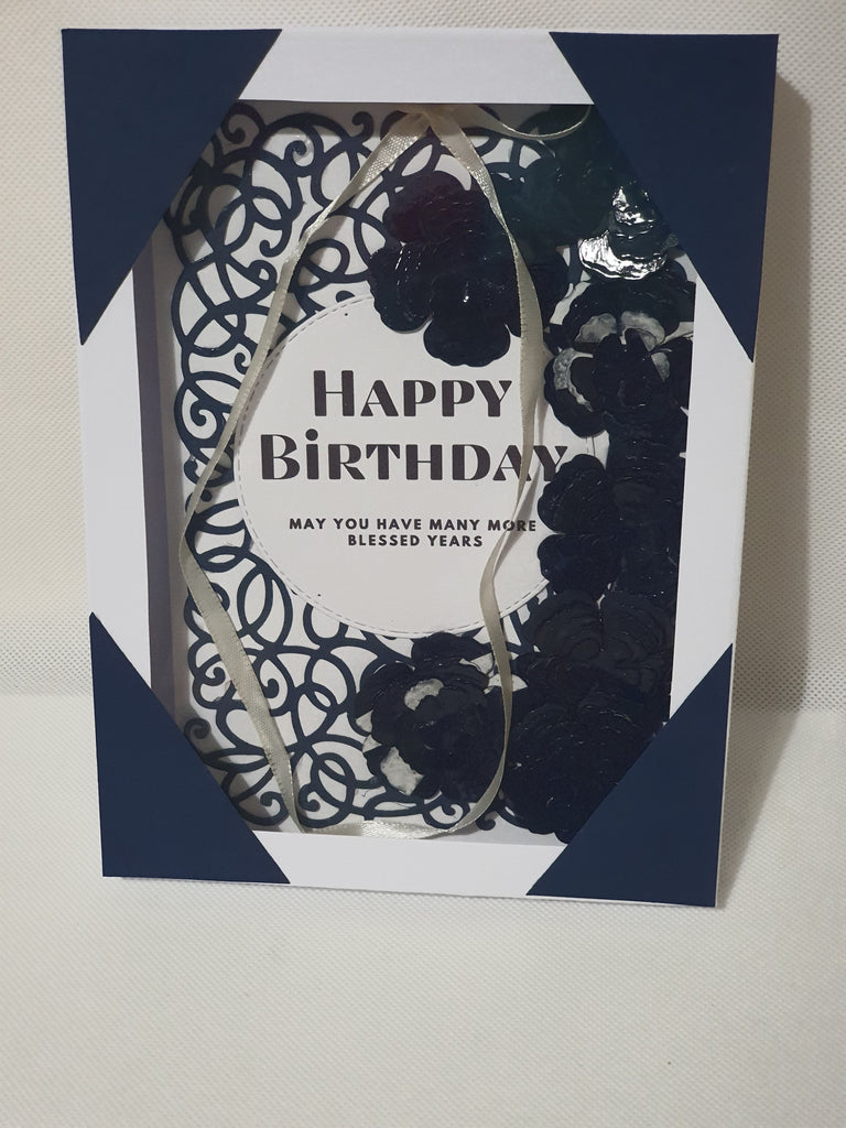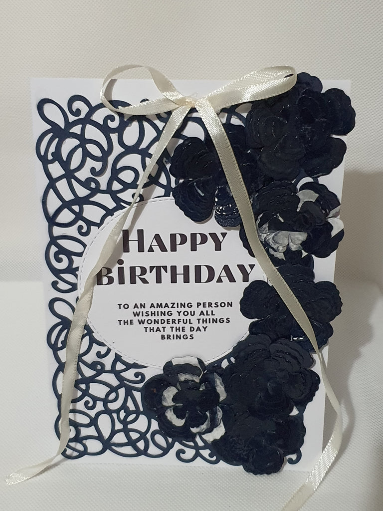 Card details: navy blue, die cut and heat embossed, matching ribbon, packaged in a see through matching box