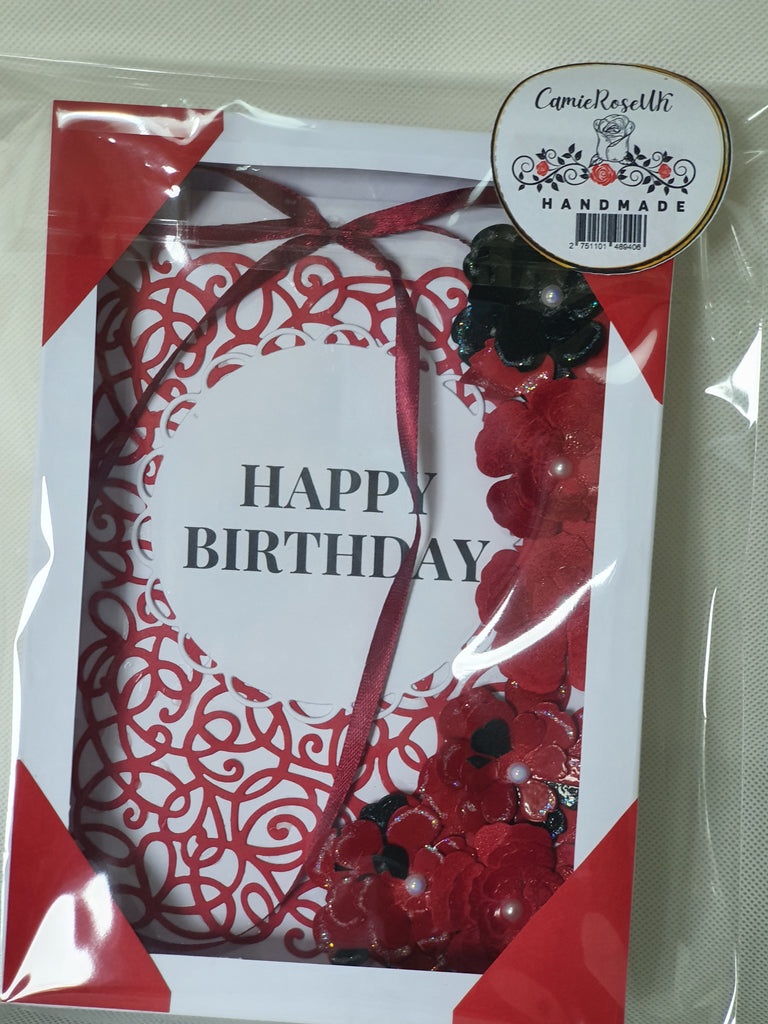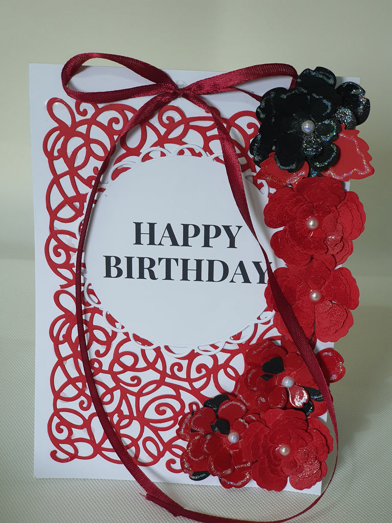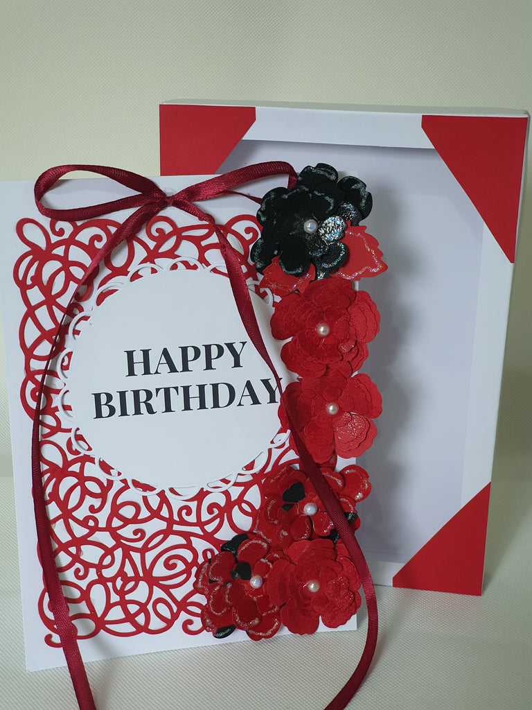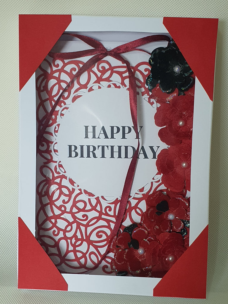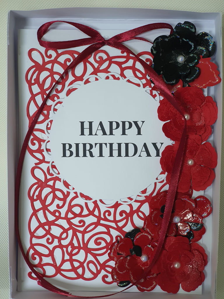 Card details: Burgundy and black (rose bush), Die cut and embossed, matching ribbon, glitter and pearl details, packaged in a see through matching box.