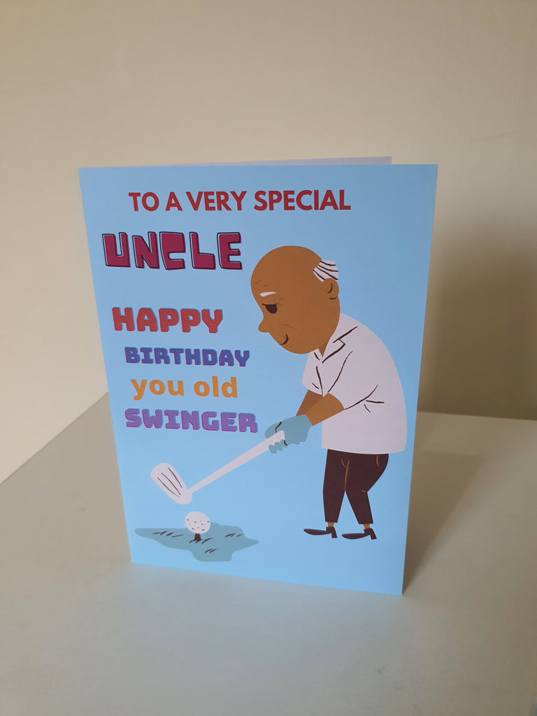 Happy birthday you old swinger card for a very special uncle, keep it light and full of smiles on their big day. The card features an older man swinging a golf club, it is blank on the inside but can be customised at the buyers request, please leave us a message regarding customisation. The card is A5 in size and printed on high quality 300gsm cardstock. It is dispatched to you in an envelope and cello bag, so we can ensure your card arrives in pristine condition.