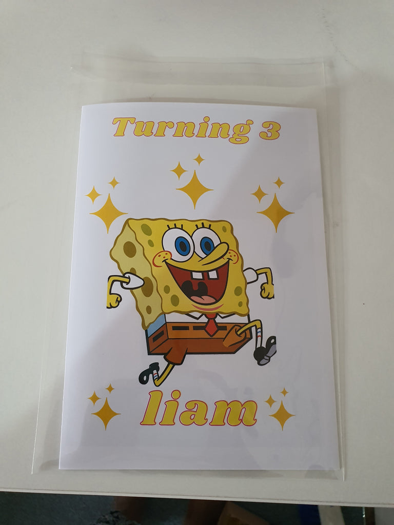 Send fin-tastic wishes to your little one with this little sprightly under the sea character, drum roll please! yes no other than sponge bob square pants our little yellow friend. Whatever age they are turning, get it customised. The card is A5 in size and printed on high quality 300gsm cardstock, it is blanked on the inside but that just leaves lots of room for your customisation, making it all the more special. The card is dispatched to you in an envelope and cello bag, so we can ensure your card arrives in pristine condition.