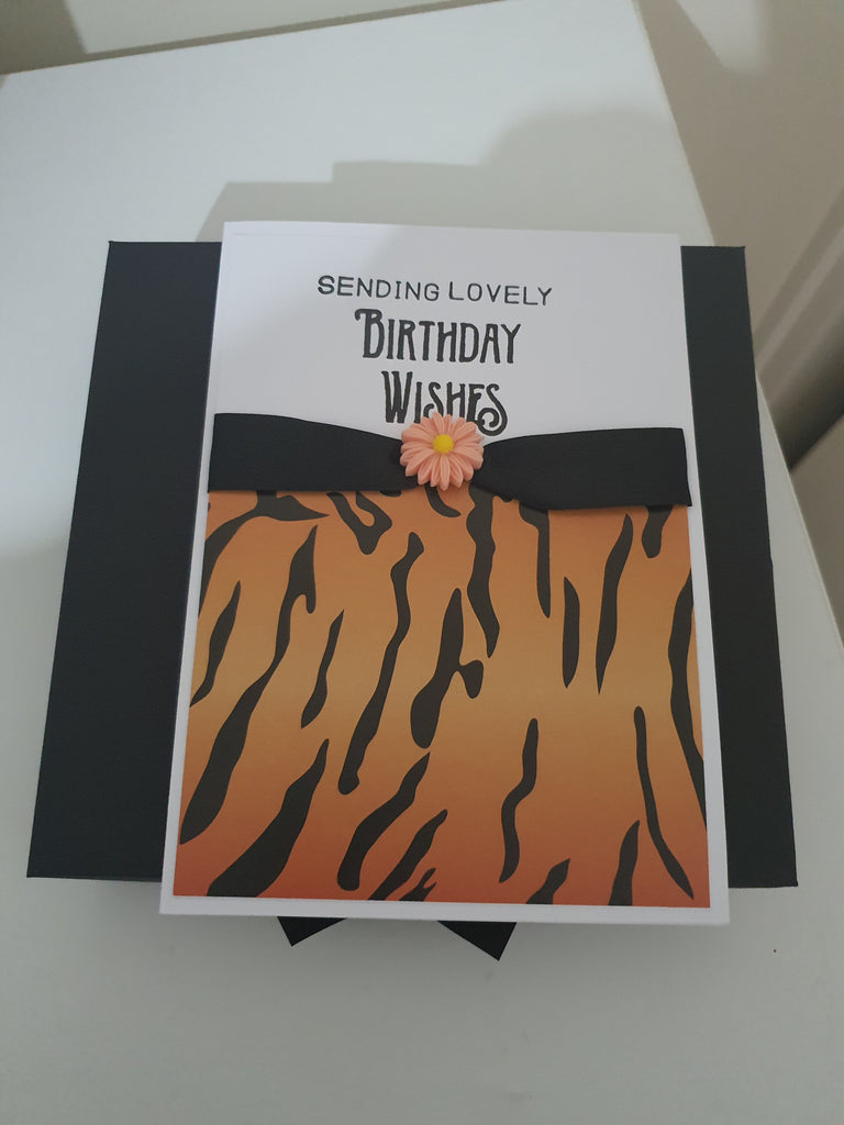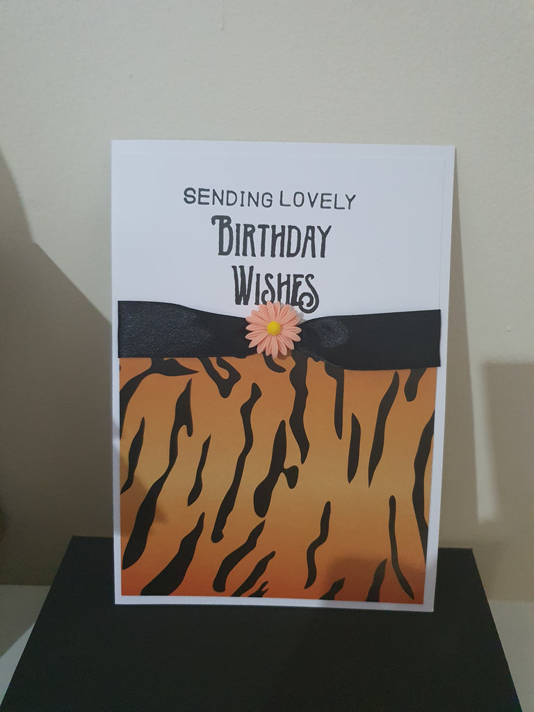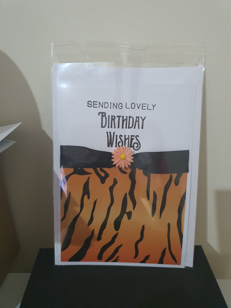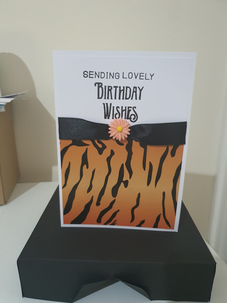 Sending lovely birthday wishes Tiger print card with ribbon and embellishment for the animal print lover. The card is hand stamped with a bold beautiful message, it is blank on the inside, only one piece available, no customisation on this card. The card is A5 in size and printed on 300gsm cardstock. It is dispatched to you in an envelope and cello bag, so we can ensure your card arrives in pristine condition.