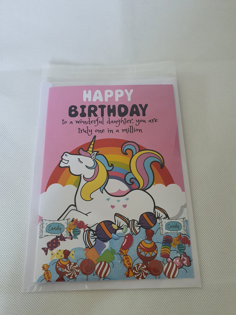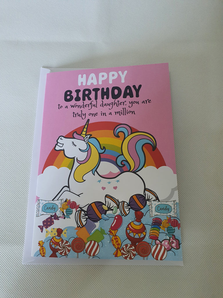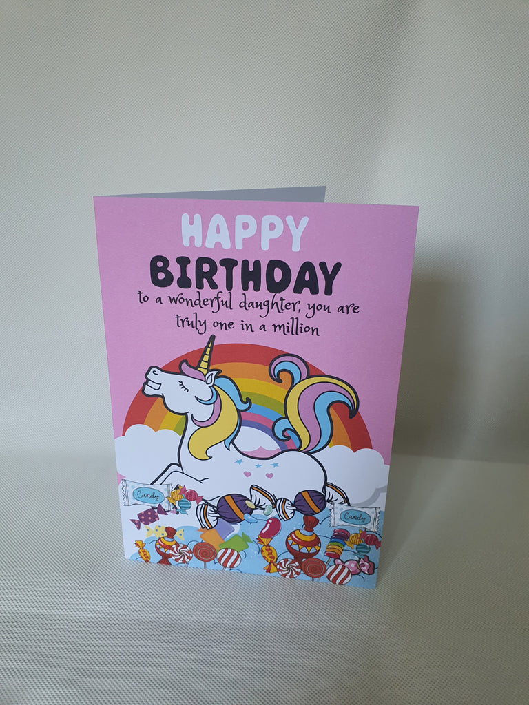 Happy birthday to a wonderful daughter, unicorn birthday card, perfect for the one who loves all things magical. The card is A5 in size and printed on 300gsm card stock. It is dispatched in an cello bag, so we can ensure your card arrives in pristine condition.