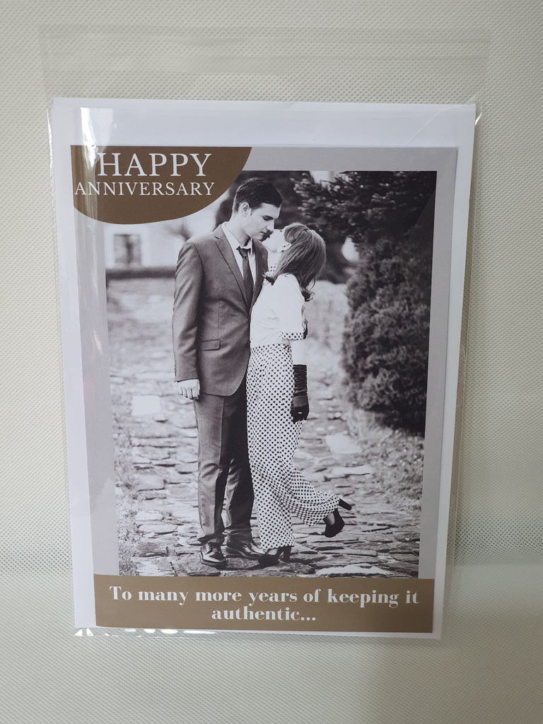 A great anniversary card for everyone, vintage design and heart warming sentiments, to many more years of keeping it authentic. The card is A5 in size and printed on high quality 240gsm textured cardstock, it is blanked on the inside but can be customised at the buyers request, please leave us a message at checkout. We dispatch all our cards in an envelope and cello bag, this ensures that your card gets to you in pristine condition.