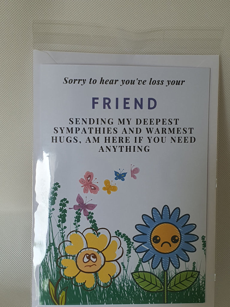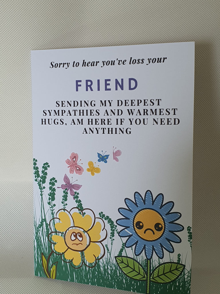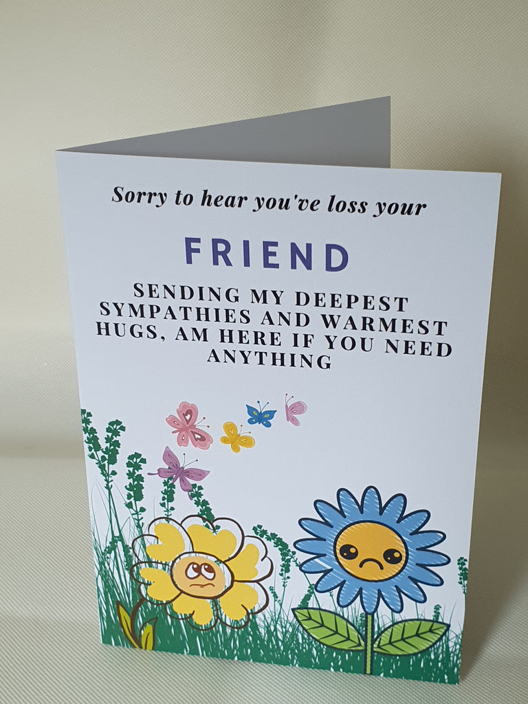 Sometimes when it's all too difficult to say it yourself; say it with a card. Our sorry to hear you've loss your friend card will show them how you feel in not so many words. This card is A5 in size and printed on 300gsm cardstock. It is dispatched to you in an envelope and cello bag, so we can ensure your card arrives in pristine condition. The card can be customised at buyers request, please leave us a message regarding personalisation.