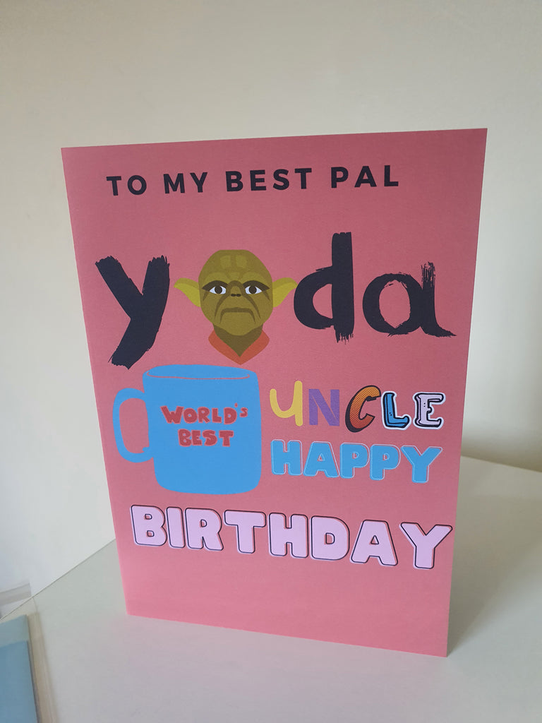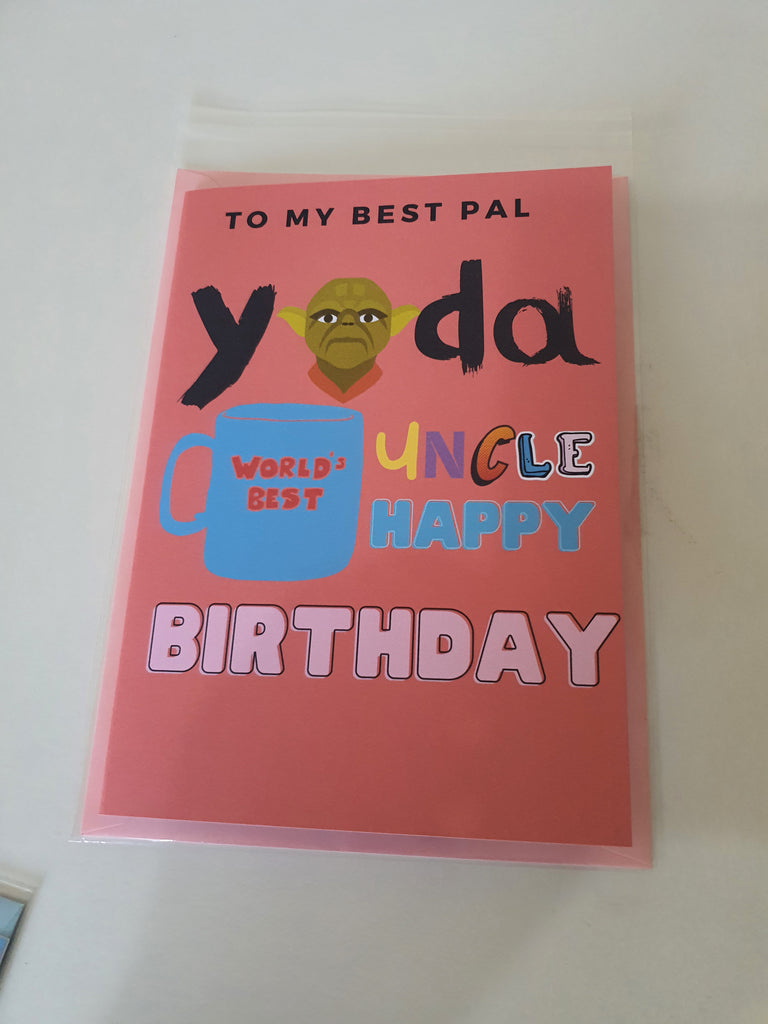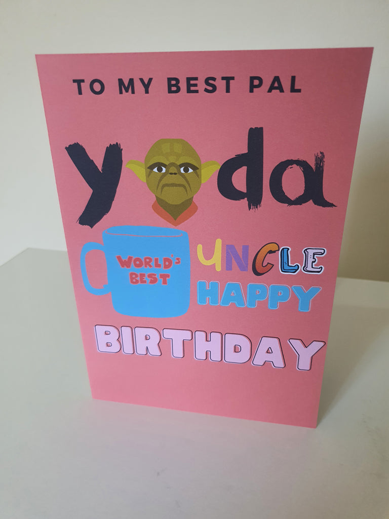 Yoda world's best uncle birthday card, an inspired star wars card with lots of colourful fonts. The card is blank on the inside but can be customised at the buyers request, please leave us a message regarding customisation. The card is A5 in size and printed on high quality 300gsm cardstock. It is dispatched to you in an envelope and cello bag, so we can ensure your card arrives in pristine condition.